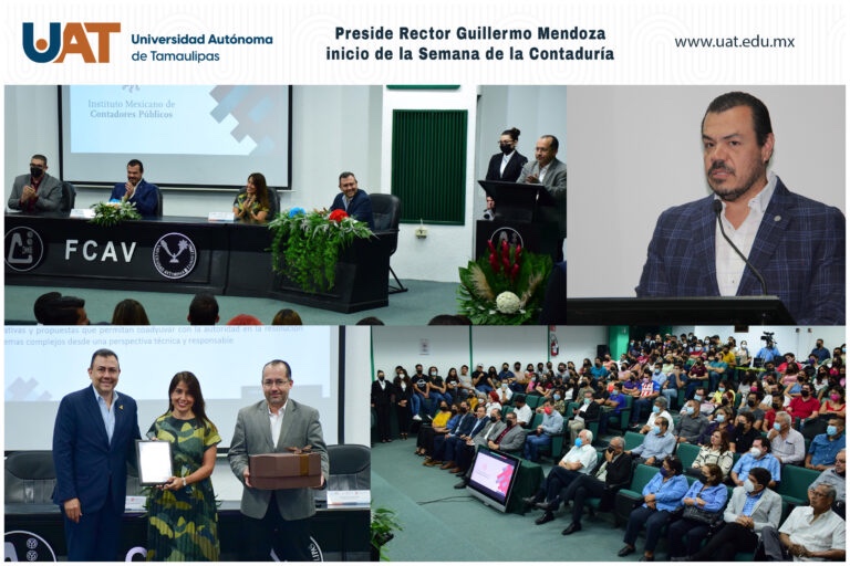 El C. P. Guillermo Mendoza Cavazos, Rector de la Universidad Autónoma de Tamaulipas (UAT), presidió el inicio de la Semana de la Contaduría Pública 2022 “Reimaginando el Futuro de Nuestra Profesión”, organizada por la Facultad de Comercio y Administración Victoria (FCAV) y el Colegio de Contadores Públicos de esta ciudad capital.