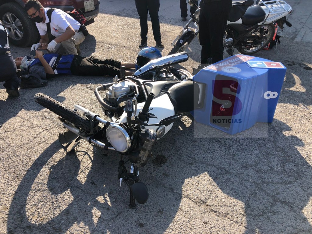 Ciudad Victoria, Tamaulipas. – Un empleado de Domino’s Pizza fue llevado al Seguro Social donde quedó internado al sufrir diversos golpes en todo el cuerpo, luego de chocar la motocicleta que tripulaba contra una camioneta que le cerró el paso y luego la conductora intentó darse a la fuga y en esos momentos un repartidor de Rappi se le atravesó para evitarlo.