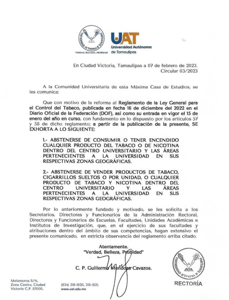 La circular firmada por el rector de la máxima casa de estudios de Tamaulipas, Guillermo Mendoza Cavazos señala que queda estrictamente prohibido fumar y comercializar estos productos, para que se respete dicha ley que entró en vigor el pasado 15 de enero.
