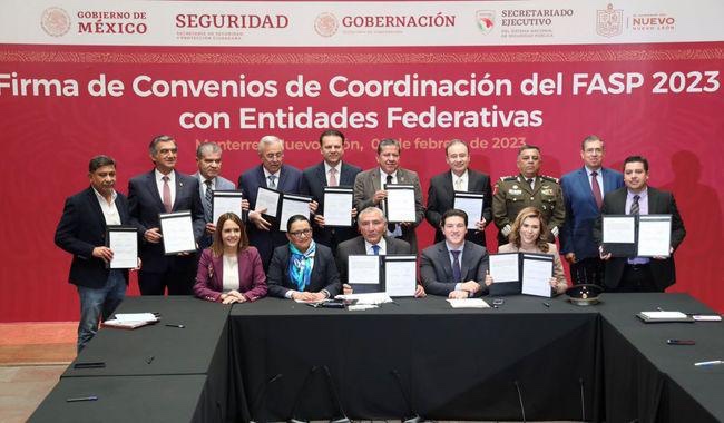 La funcionaria de seguridad participó en la firma Convenios del Fondo de Aportación para Seguridad Pública 2023 (FASP), presidida por el secretario de Gobernación, Adán Augusto López y diez gobernadores, entre ellos el gobernador de Tamaulipas, Américo Villarreal Anaya, celebrada en el Palacio de Gobierno de Nuevo León.