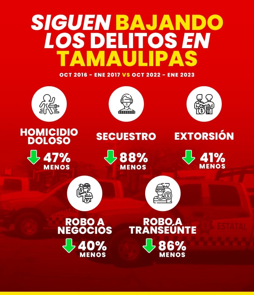 De acuerdo a un comparativo de octubre de 2016 a enero de 2017, contra octubre 2022-enero 2023, lo que significan los primeros cuatro meses de un nuevo gobierno en Tamaulipas, 18 de 22 indicadores registraron cifras a la baja en la comisión de delitos del fuero común, entre ellos: homicidio doloso, secuestro, robo a casa habitación, extorsión, robo a negocio, robo a transporte y robo a vehículo.