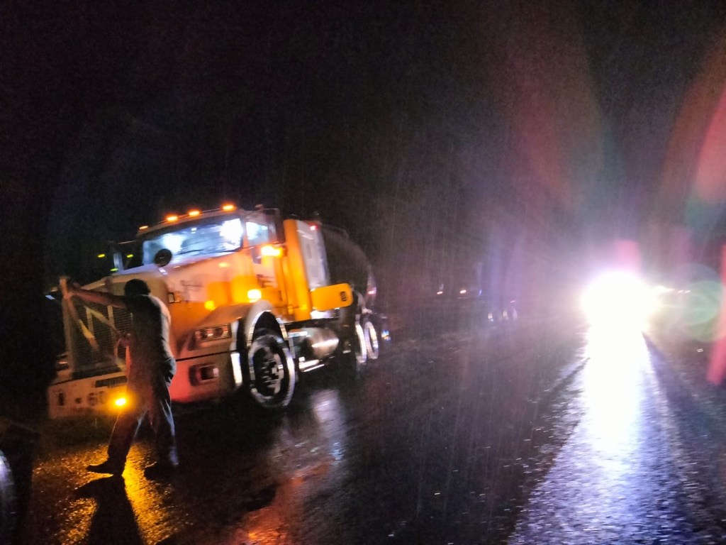 Hidalgo, Tamaulipas.-Un tractocamión de doble remolque derrapó al circular por el kilómetro 45 de la Carretera Federal 85 Victoria-Monterrey a la altura del municipio de Hidalgo.