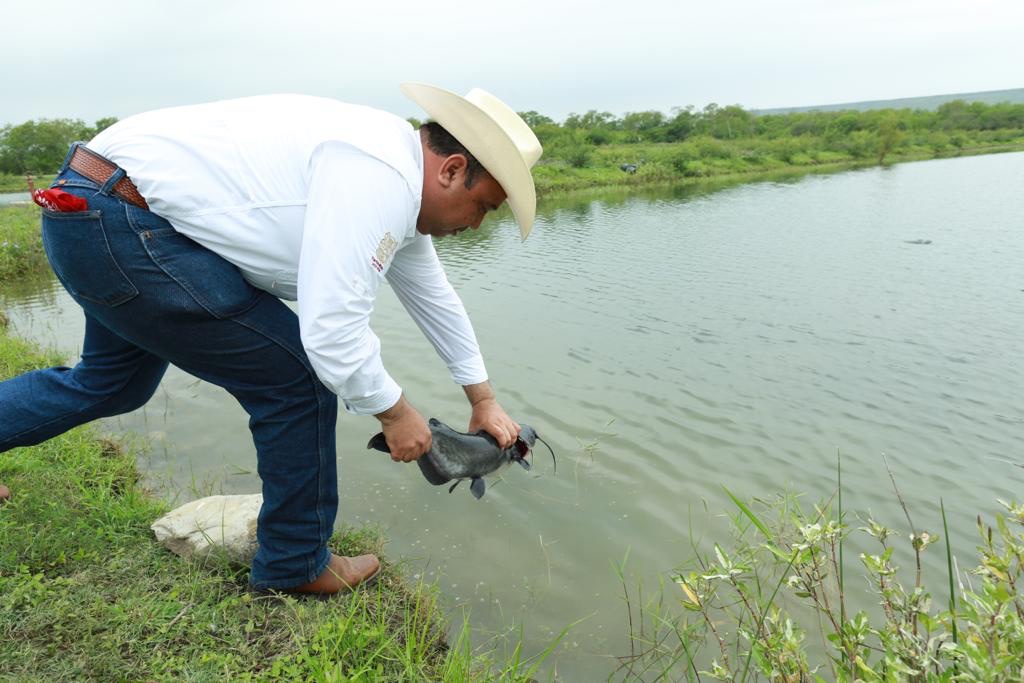El titular de la Secretaría, Juan Jesús Hernández Torres, encabezó los trabajos de liberación de reproductores de bagres de canal, colocando 150 hembras y 70 machos en los estanques para el desove de la hueva, las cuales se depositarán por las hembras en los nidos en un promedio de 5 a 10 días.