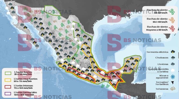 El SMN señaló que se esperan lluvias puntuales intensas acompañadas de descargas eléctricas, posible caída de granizo y rachas de viento en Veracruz, Chiapas y Tabasco, muy fuertes en Tamaulipas, San Luis Potosí, Puebla, Campeche, Yucatán y Quintana Roo, y lluvias fuertes en Coahuila, Nuevo León, Hidalgo y Tlaxcala.