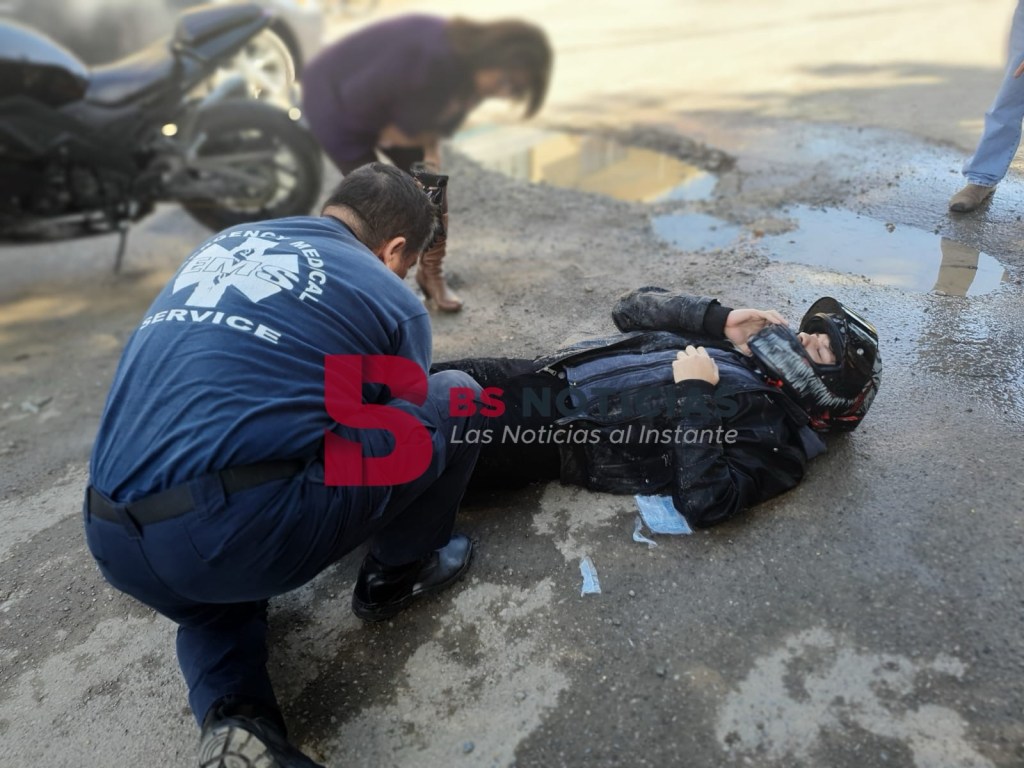 Cuando circulaba a bordo de su motocicleta un individuo cayó en un bache y perdió el control para terminar siendo atendido en el lugar