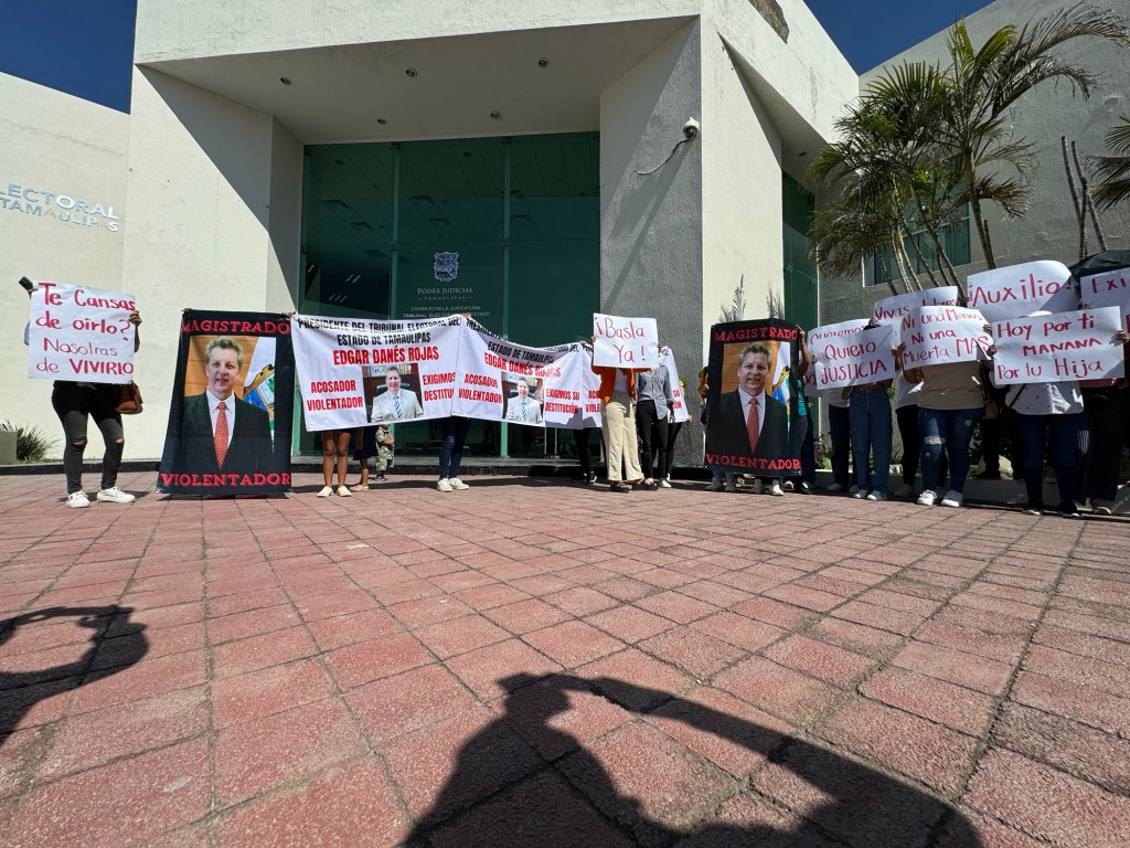 Ciudad Victoria, Tamaulipas.- Cansados de que las autoridades no hagan caso, esta mañana un grupo de manifestantes acudió hasta la sede del Tribunal Electoral del Poder Judicial de Tamaulipas para protestar contra el magistrado Edgar Danés Rojas, quien tiene denuncias por acoso sexual en contra de una ex trabajadora de dicho sitio.