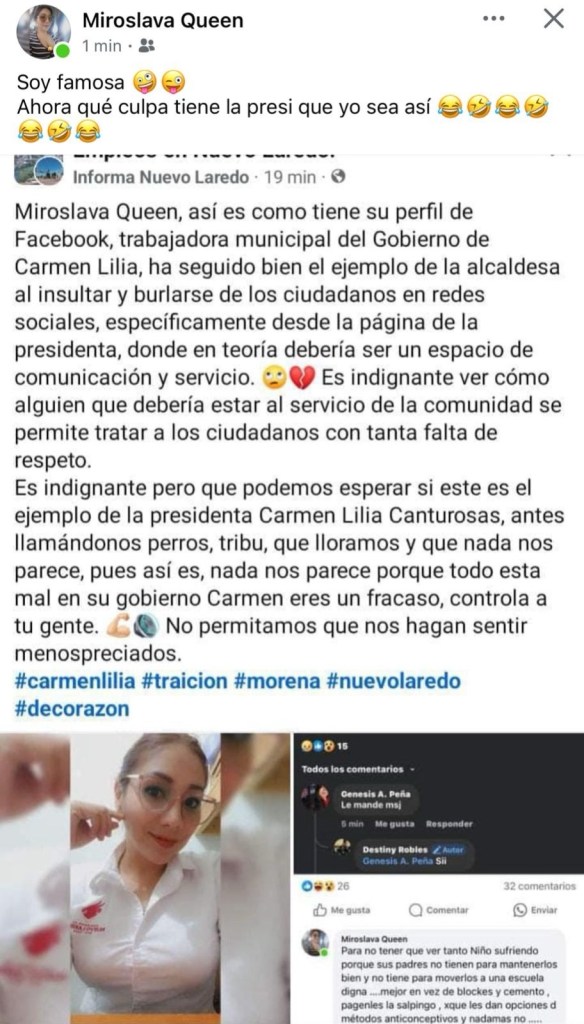 Nuevo Laredo, Tamaulipas, 29 de agosto de 2024 .- Una controversia ha estallado en redes sociales tras la publicación de un comentario clasista y discriminatorio por parte de una empleada municipal, identificada como Miroslava Queen. En un grupo de Facebook, Queen ridiculizó a los niños y niñas de la colonia Praderas del Mezquital, quienes estudian en condiciones precarias. Su comentario, que evidenció una postura despectiva hacia la situación económica de las familias, ha generado una ola de indignación entre la ciudadanía.