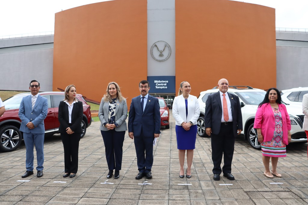 Ciudad Victoria, Tamaulipas.- El rector de la Universidad Autónoma de Tamaulipas (UAT), Dámaso Anaya Alvarado, presidió en el Campus Tampico la entrega de vehículos a cada una de las facultades de la zona sur, así como equipamiento para la protección y seguridad de la comunidad universitaria.