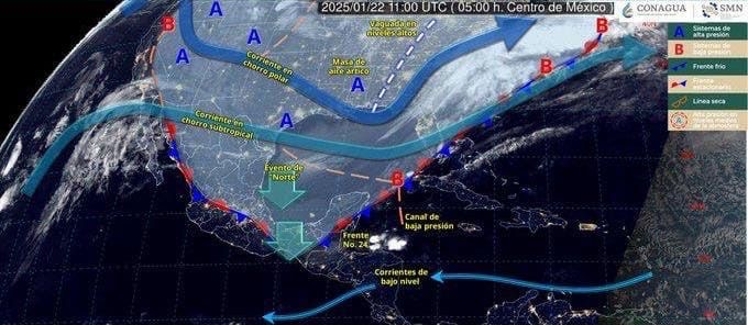 La corriente en chorro subtropical, se localiza desde el sur de la península de Baja California hasta noreste de México y originará rachas de viento de 80 a cien kilómetros por hora en Baja California; además de rachas de 50 a 70 kilómetros por hora en Baja California Sur y Sonora, acompañándose de oleaje de uno a tres metros de altura en el Golfo de California.
