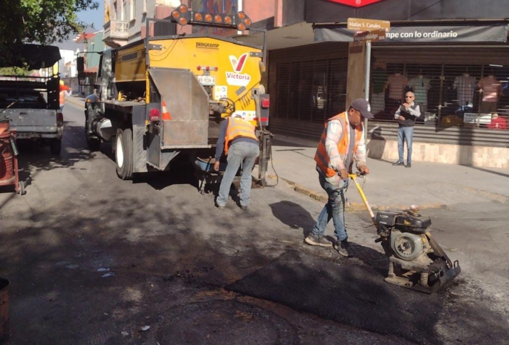 Cuadrillas del Departamento de Rehabilitación de Pavimento centraron su labor de sustitución de 120 metros cuadrados de asfalto averiado en calle Hidalgo, del 9 al 15 y del 12 al de la calle Zaragoza.