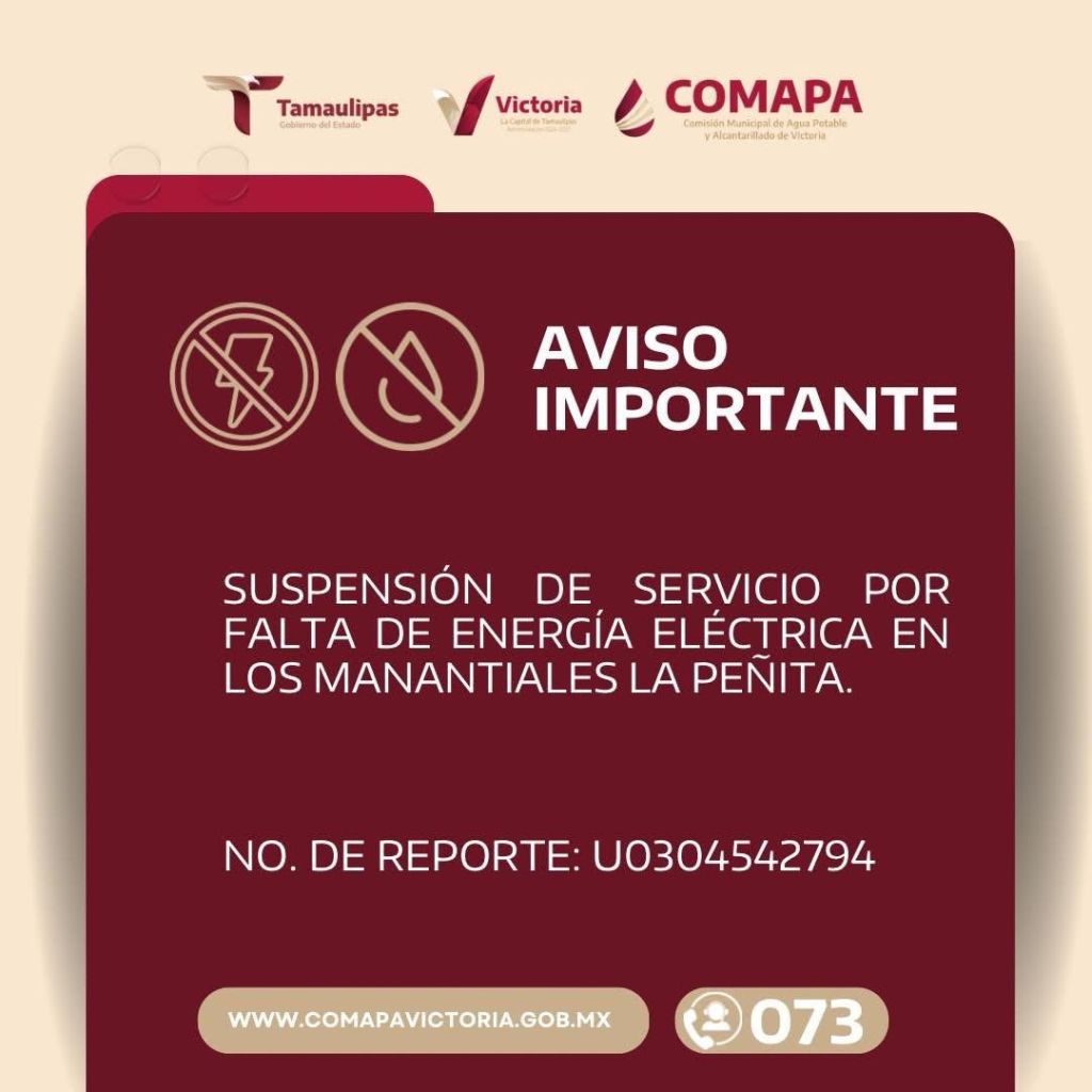La Comisión Municipal de Agua Potable y Alcantarillado (Comapa Victoria) informó este día que, debido a un corte en el suministro de energía eléctrica en los manantiales de La Peñita, varias colonias y fraccionamientos de la zona oriente de la ciudad se encuentran sin servicio de agua potable