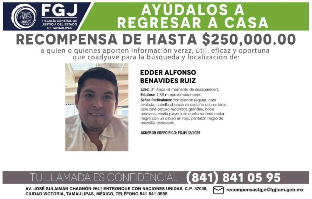 Ciudad Victoria, Tamaulipas.- La Fiscalía General de Justicia del Estado de Tamaulipas (FGJE) ofrece 250 mil pesos de recompensa para quien ofrezca información que permita dar con Edder Alfonso Benavides Ruiz, desaparecido en Padilla.