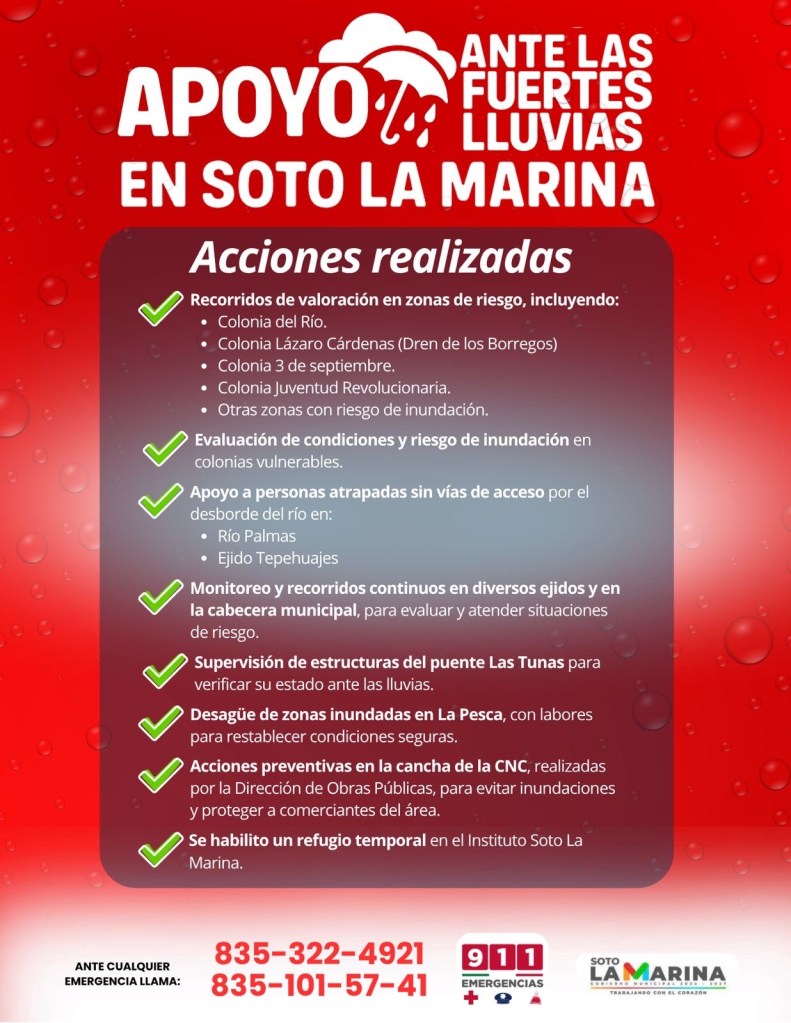 En respuesta a las intensas lluvias registradas en el municipio, el Gobierno de Soto la Marina implementó una serie de acciones coordinadas para atender a la población afectada y mitigar los riesgos derivados de las inundaciones, informó la alcaldesa Glynnis Georgina Jiménez Vázquez