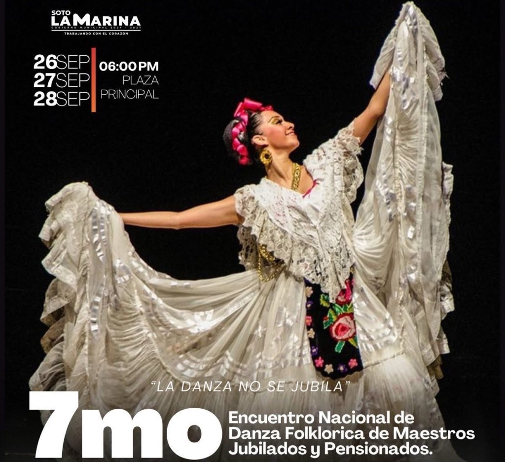 Soto la Marina, Tamaulipas.- Soto la Marina será sede del 7º Encuentro Nacional de Danza Folklórica de Maestros Jubilados y Pensionados, a celebrarse los días 26, 27 y 28 de septiembre en la Plaza Principal del municipio, a partir de las 6:00 de la tarde.