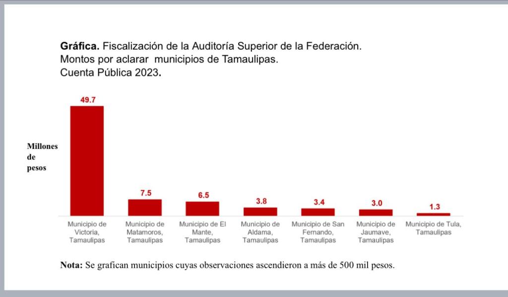 Sin embargo, estos resultados aún no se reflejan de igual manera en los municipios; los últimos informes que comparte la Auditoría Superior de la Federación, revelan que Victoria, la capital de Tamaulipas cuenta con 49.7 millones de pesos observados.